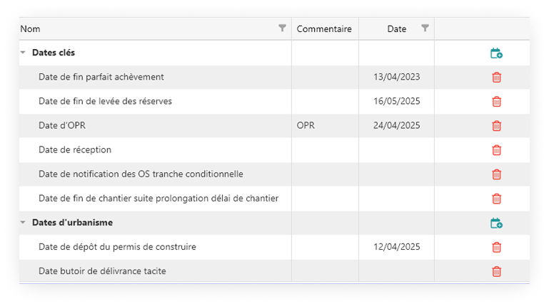 ArchiLid simplifie le suivi des étapes importantes d’un projet grâce à son système de gestion des dates clés, organisées en trois catégories : urbanisme, marché et dates clés. Chaque étape possède une date et un commentaire, offrant une compréhension claire de son rôle dans le déroulement du projet.